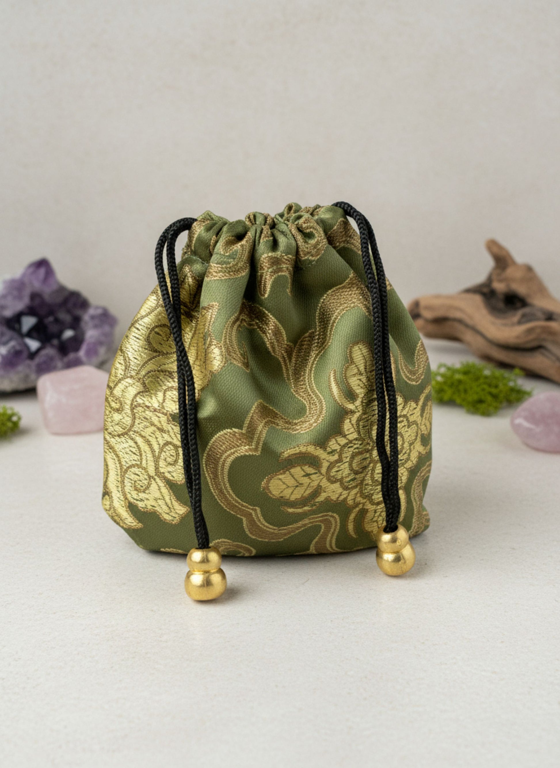 De mala is geregen op elastiek, waardoor hij comfortabel om de hals valt én eenvoudig als armband te dragen is. Wordt geleverd met een bijpassend brokaat tasje, ideaal voor opbergen of als betekenisvol cadeau.